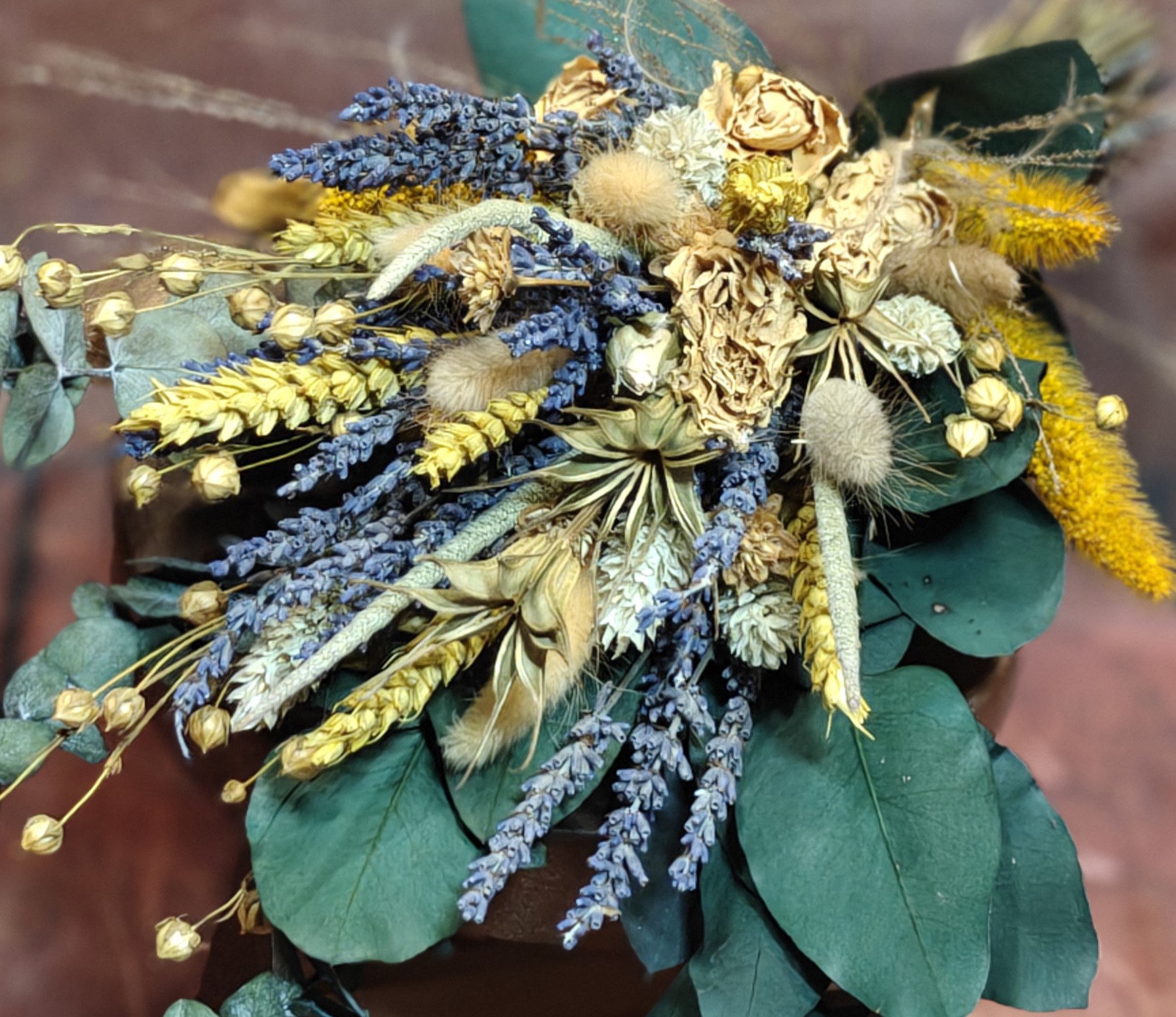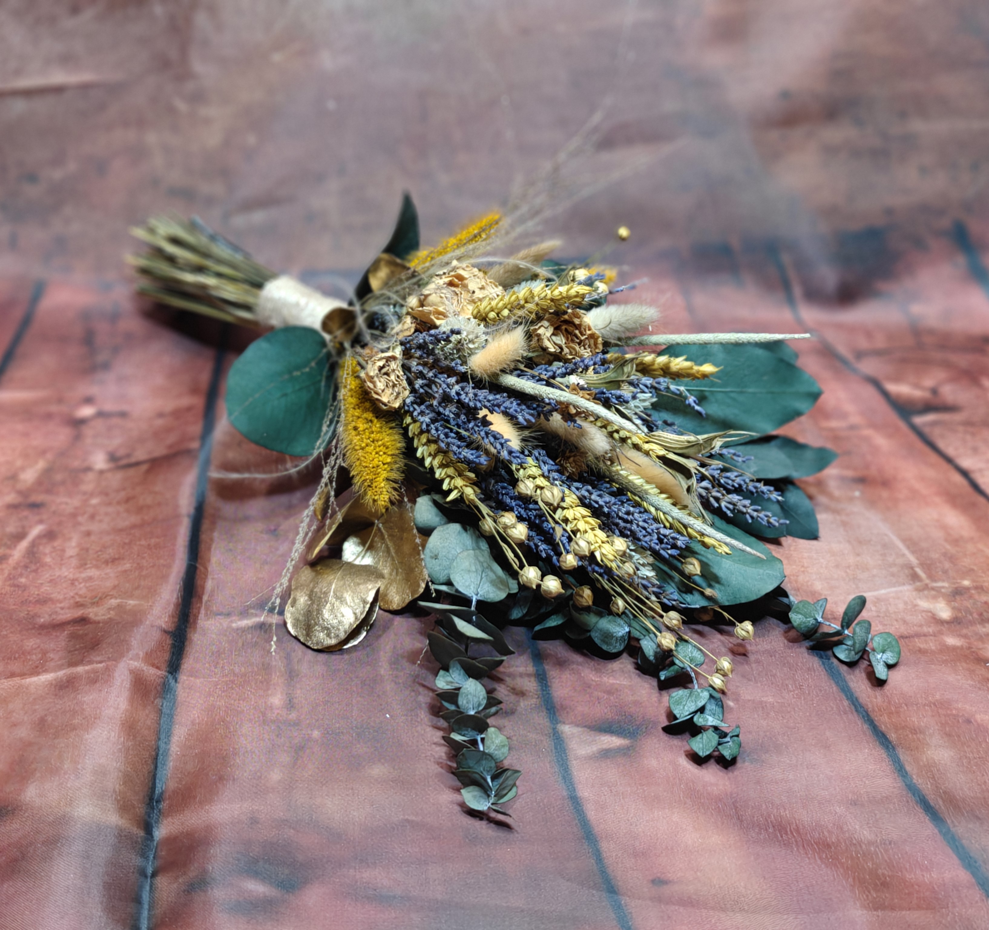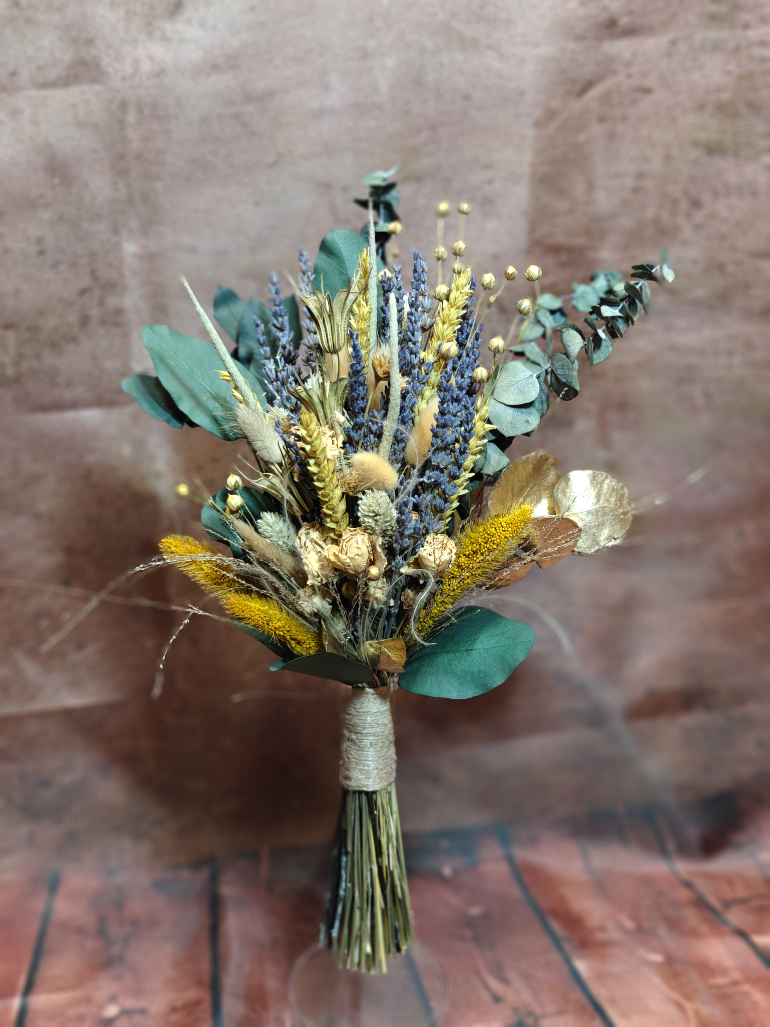 Der Strauß lebt von seiner harmonischen Mischung aus naturfarbenen Trockenblumen, aromatischem Lavendel und getrockneten gelben Sprayrosen. Die Kombination aus Goldgelb, Natur, Sand und Lavendelviolett erzeugt ein warmes, einladendes Gesamtbild, das wundervoll zu rustikalen Locations und Boho-Styling passt.