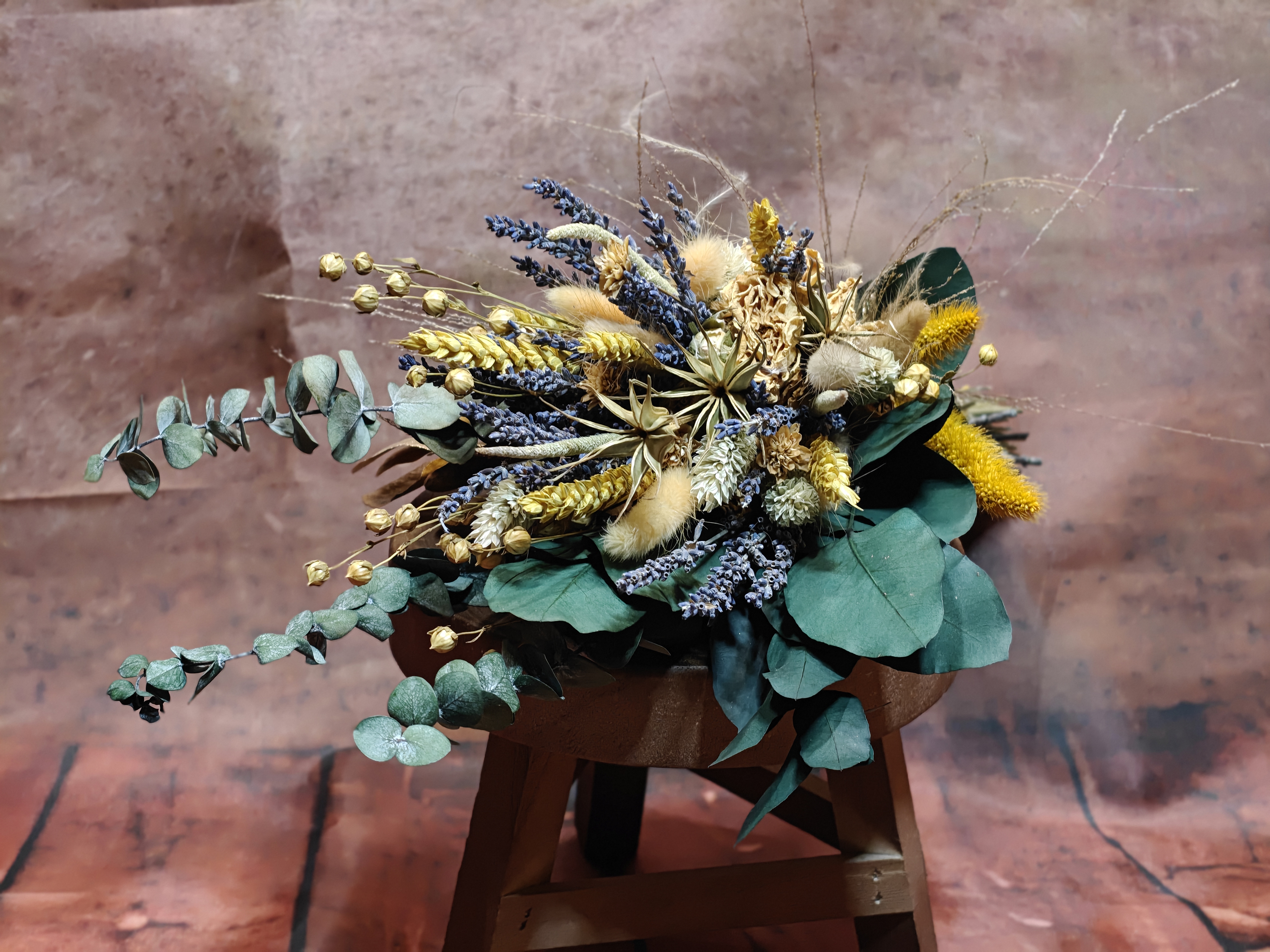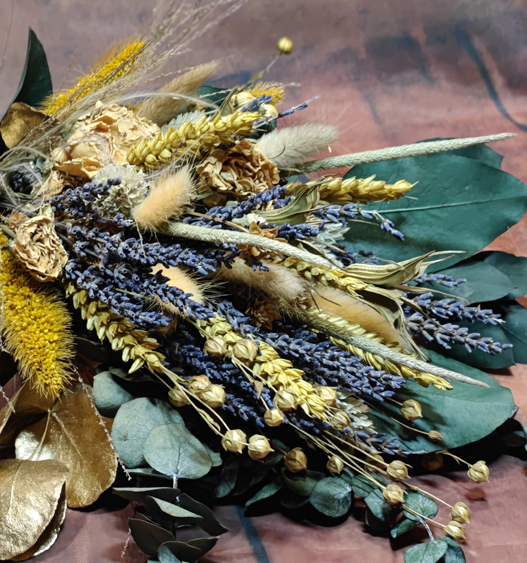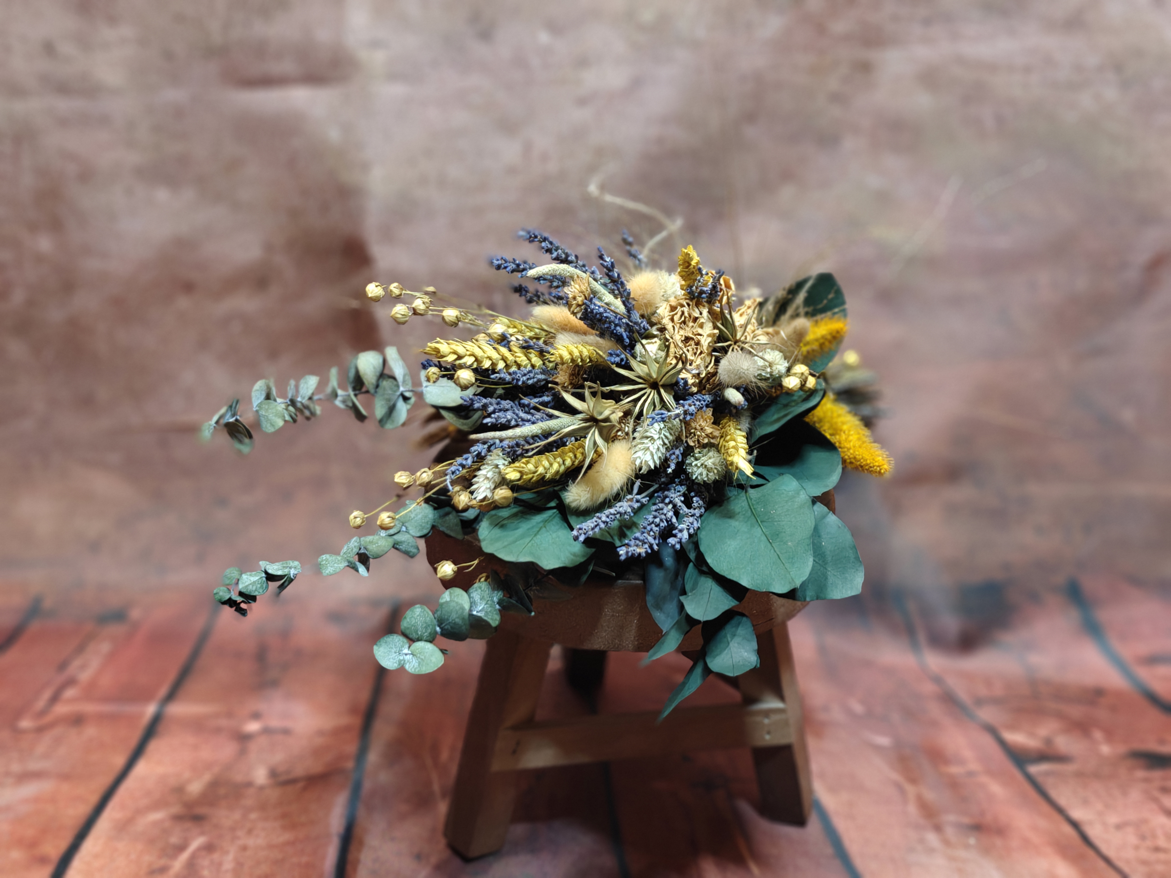 Der Strauß lebt von seiner harmonischen Mischung aus naturfarbenen Trockenblumen, aromatischem Lavendel und getrockneten gelben Sprayrosen. Die Kombination aus Goldgelb, Natur, Sand und Lavendelviolett erzeugt ein warmes, einladendes Gesamtbild, das wundervoll zu rustikalen Locations und Boho-Styling passt.