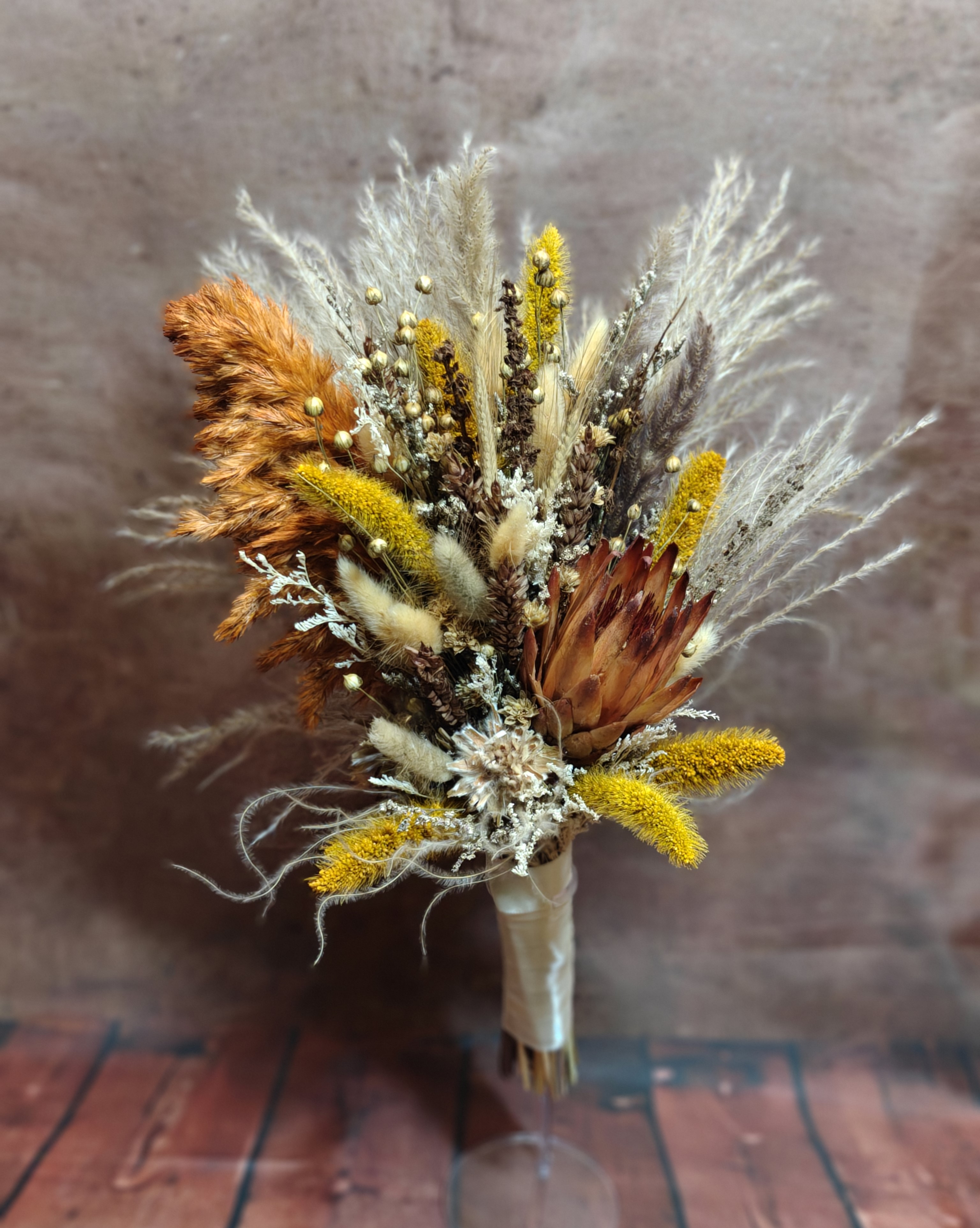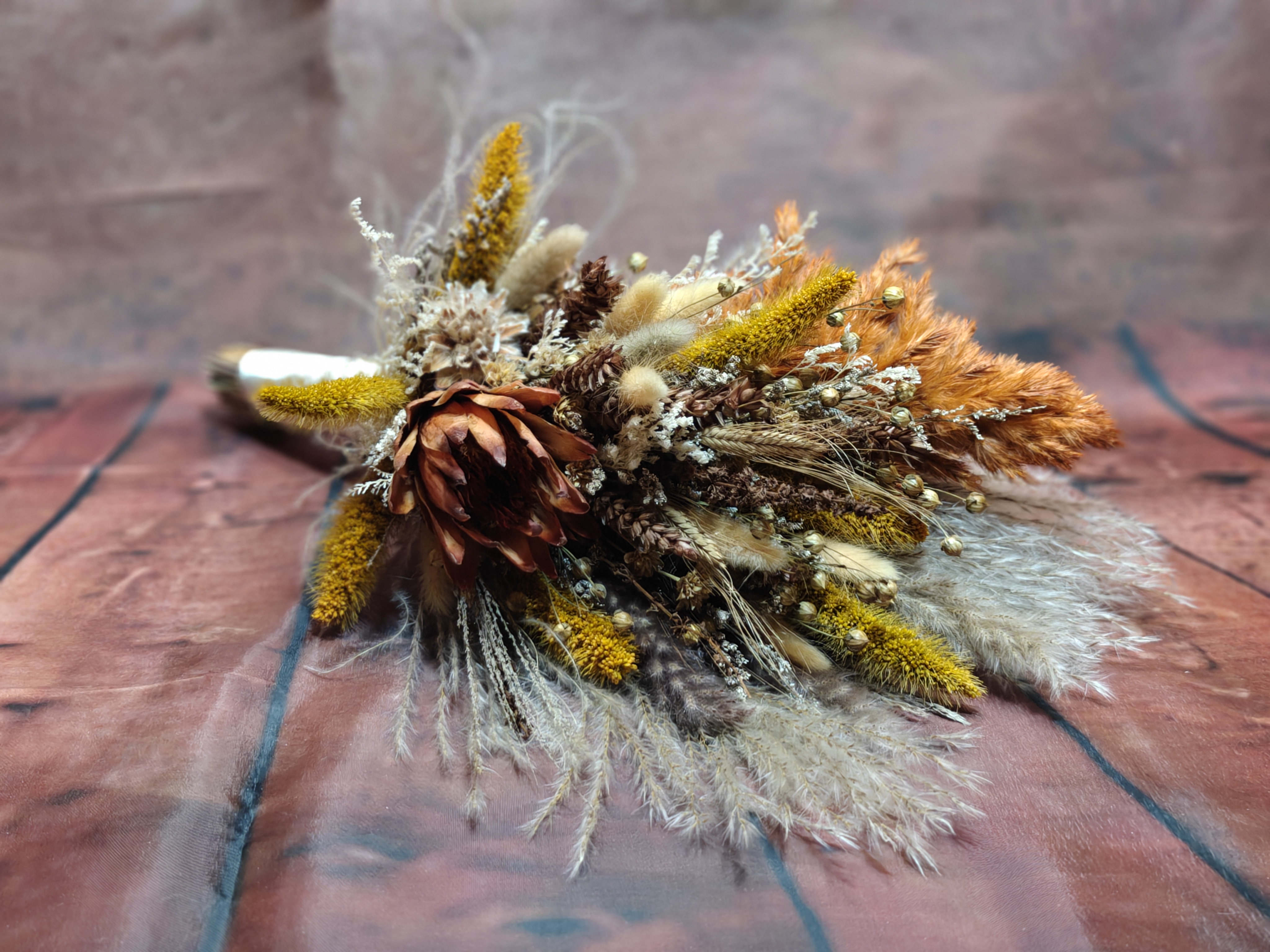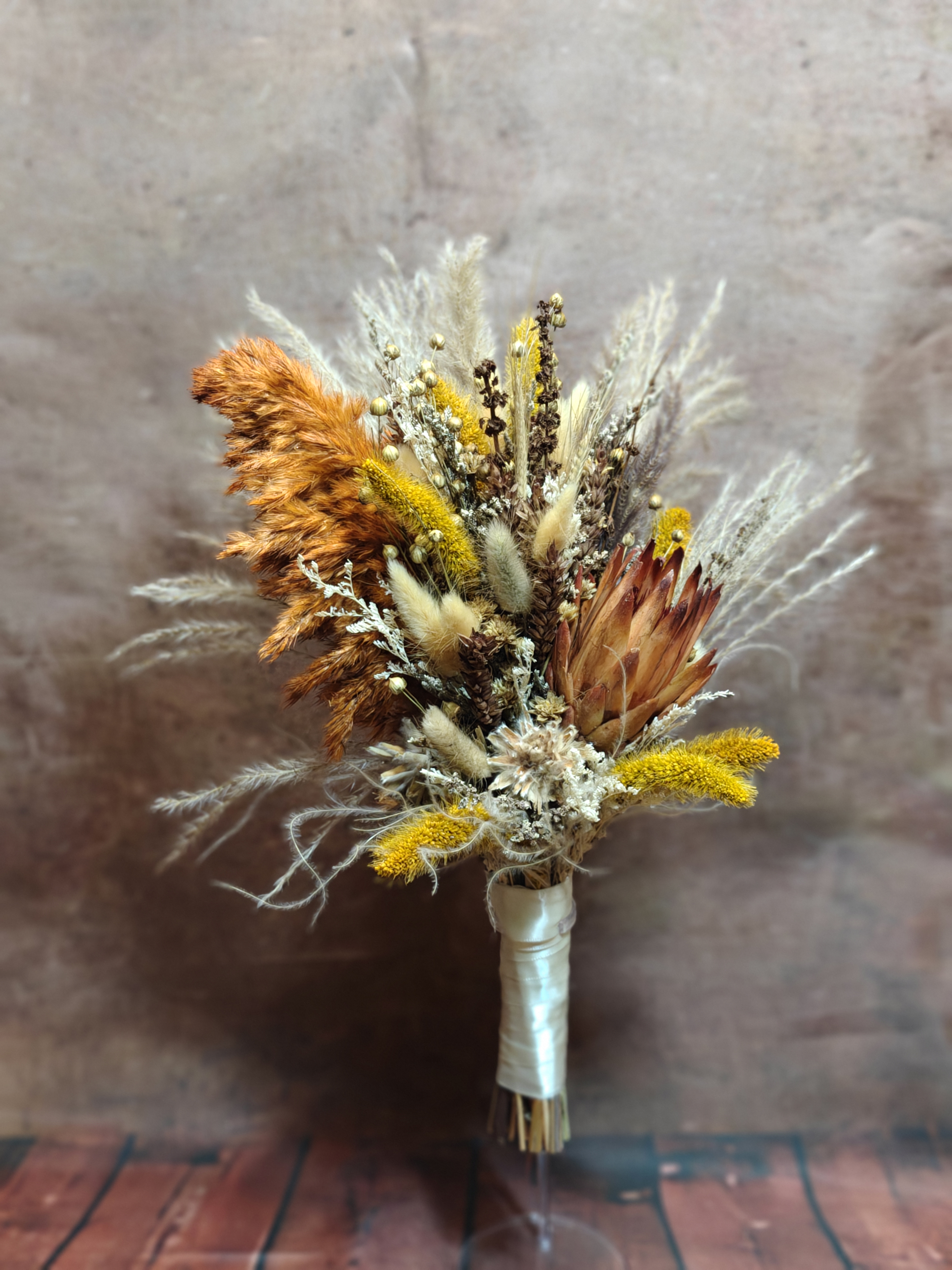 Im Zentrum steht eine beeindruckende Protea, die dem Strauß eine kraftvolle, fast skulpturale Wirkung verleiht – perfekt für ein Western- oder Ranch-inspiriertes Hochzeitssetting. Plumosa, naturfarbene Gräser, umberfarbenes Pampasgras und fein abgestimmte Trockenblumen sorgen für Volumen, Struktur und eine luftige, wild-romantische Silhouette. Die Mischung aus warmen Erdtönen, goldgelben Akzenten und weichen, natürlichen Texturen erzeugt einen rustikalen, organischen Look, der mühelos zum Boho- und Country-Stil passt.