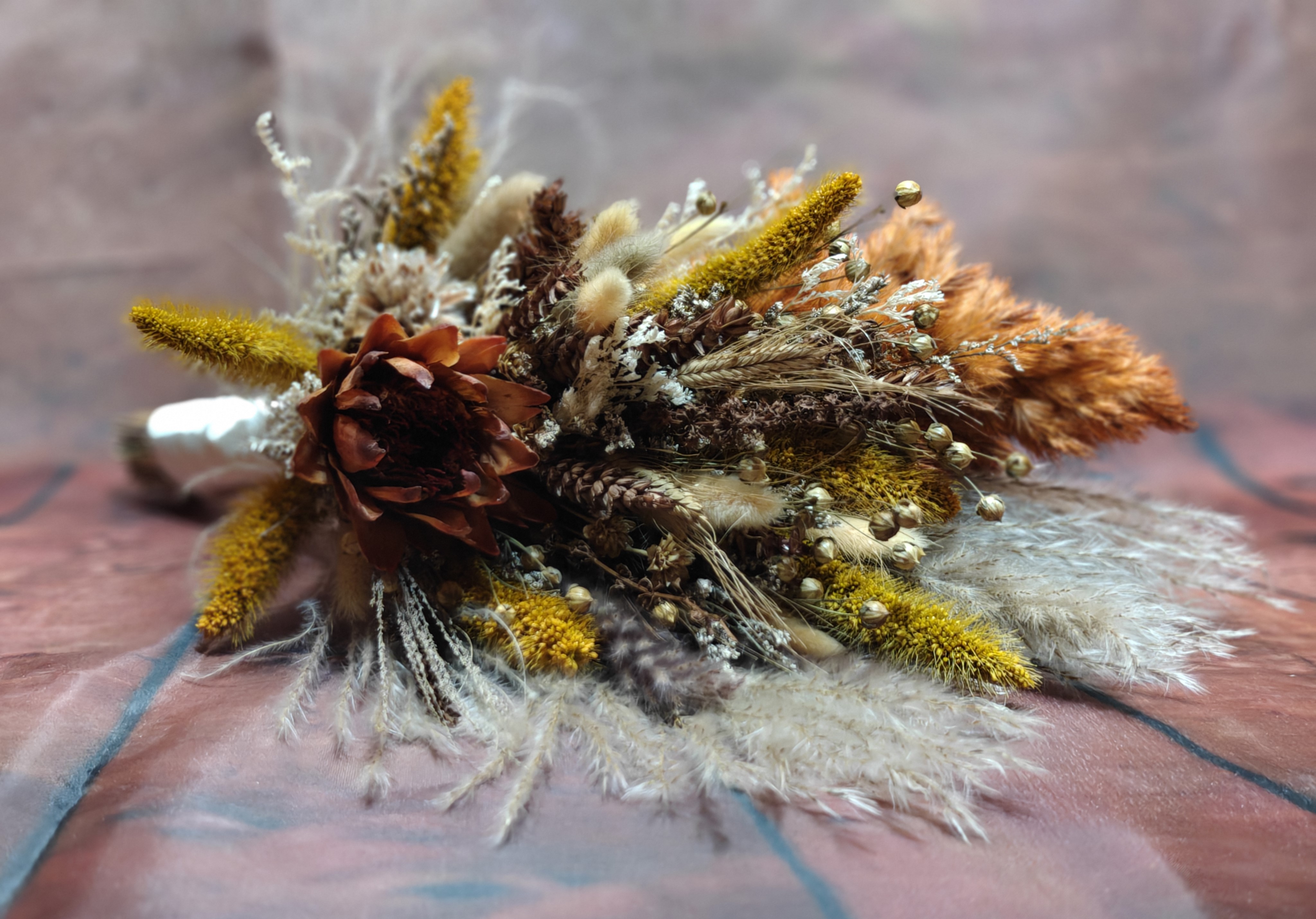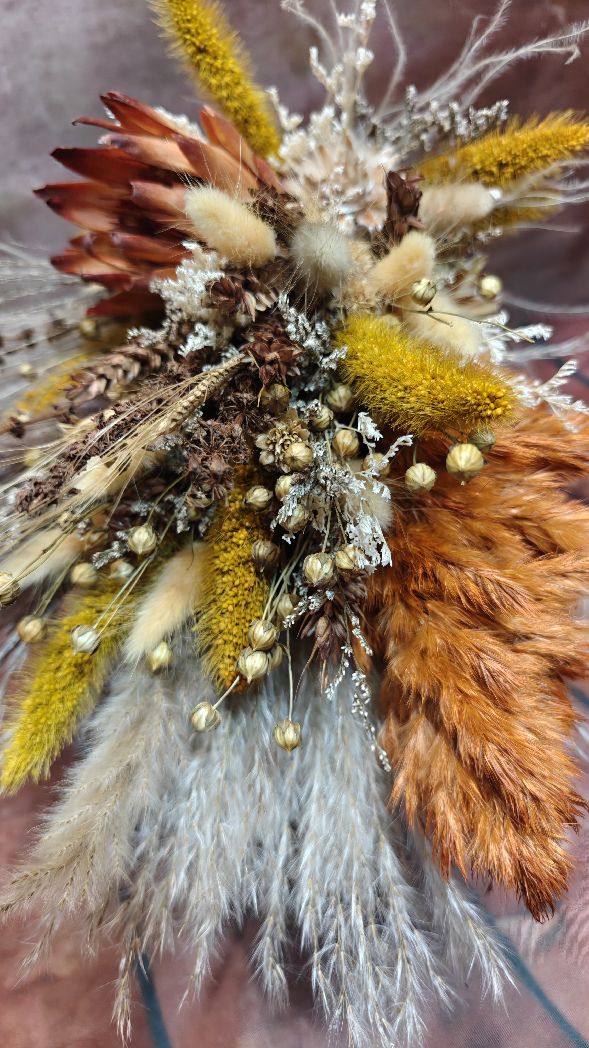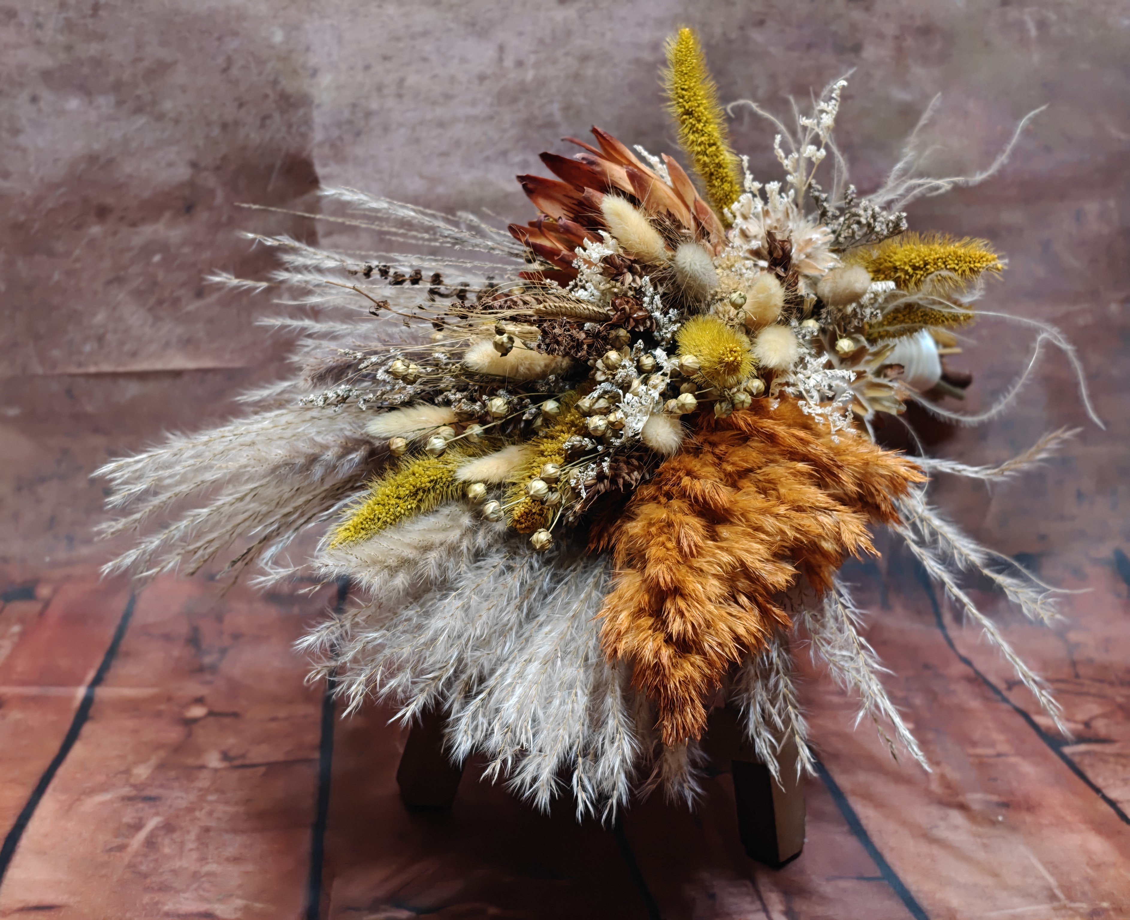 Im Zentrum steht eine beeindruckende Protea, die dem Strauß eine kraftvolle, fast skulpturale Wirkung verleiht – perfekt für ein Western- oder Ranch-inspiriertes Hochzeitssetting. Plumosa, naturfarbene Gräser, umberfarbenes Pampasgras und fein abgestimmte Trockenblumen sorgen für Volumen, Struktur und eine luftige, wild-romantische Silhouette. Die Mischung aus warmen Erdtönen, goldgelben Akzenten und weichen, natürlichen Texturen erzeugt einen rustikalen, organischen Look, der mühelos zum Boho- und Country-Stil passt.